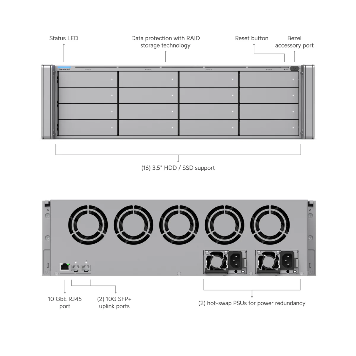 El Enterprise ENVR incluye 16 bahías para discos, compatibles con unidades HDD o SSD de 2.5" y 3.5".