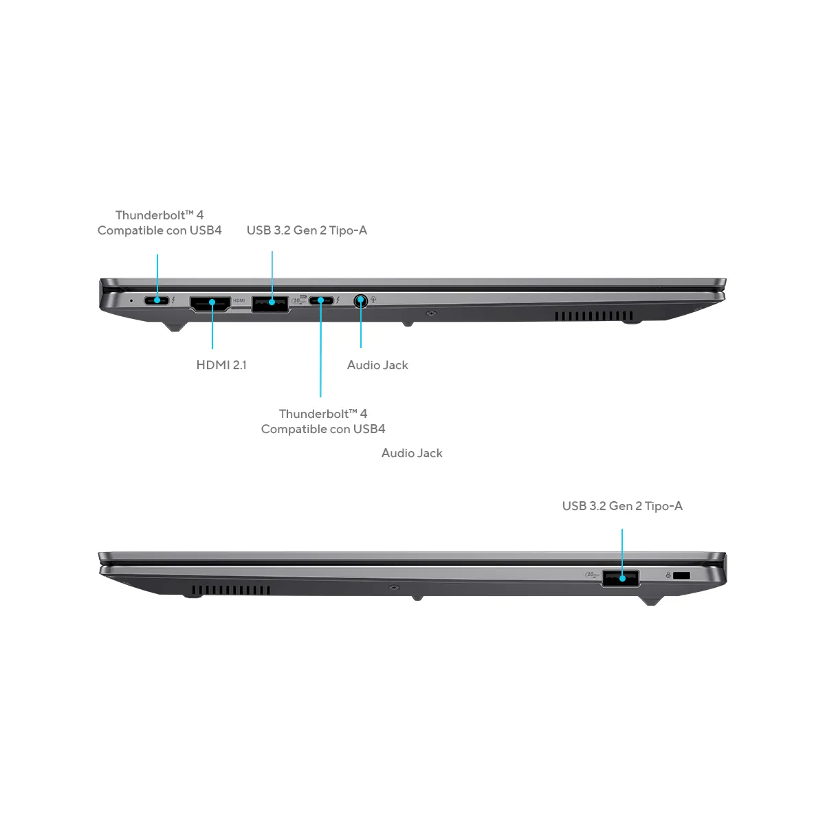 Equipado con 2 puertos USB 3.2 Gen 2 tipo A, 2 Thunderbolt 4, HDMI 2.1, y jack de audio, permite conectar múltiples dispositivos y monitores externos con facilidad. Su adaptador Type-C de 65W facilita el uso en movimiento.