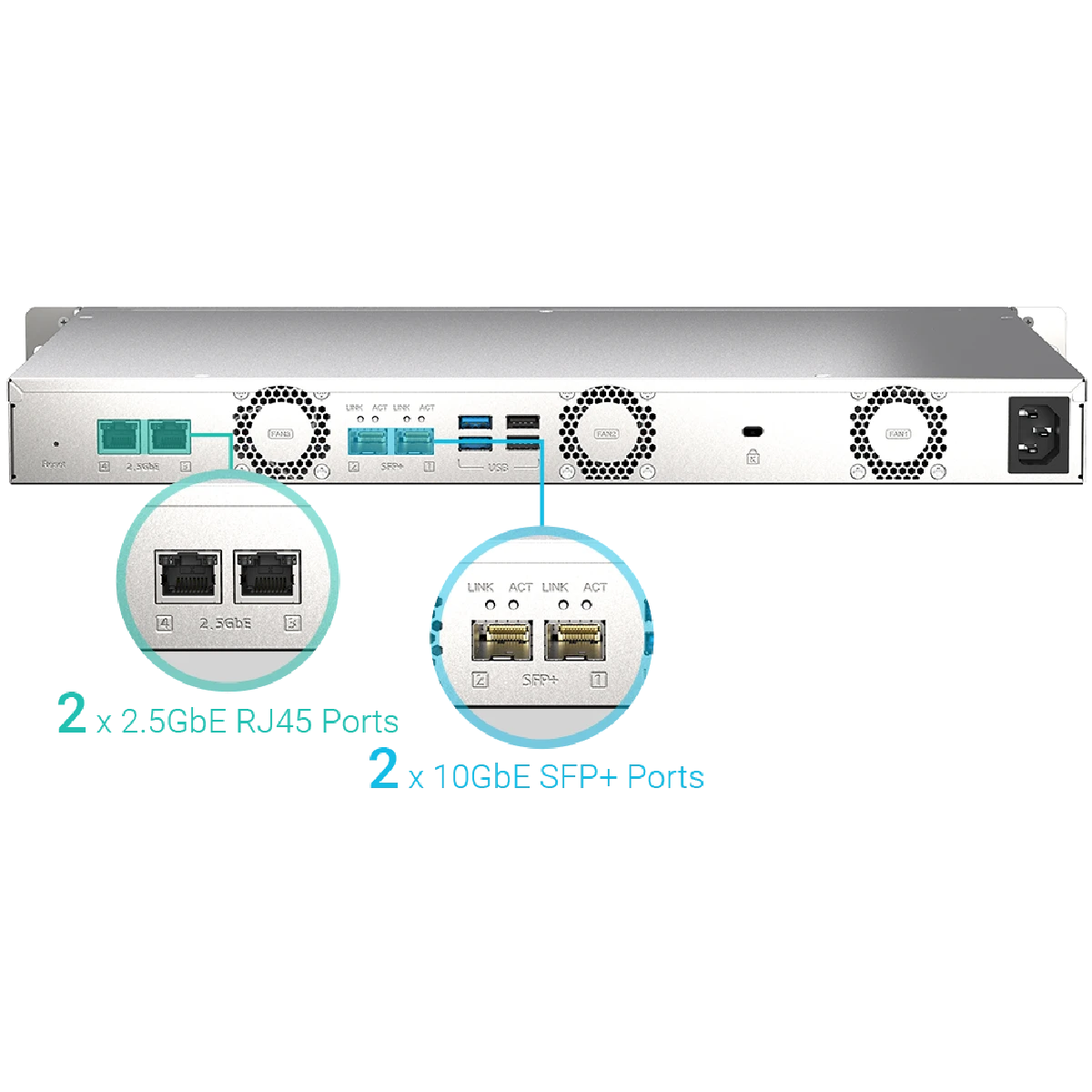 - ✅ Conectividad de Alta Velocidad: Transfiere archivos masivos en segundos gracias a sus dos puertos SFP+ 10GbE y dos puertos 2.5GbE, ideales para flujos de trabajo intensivos.