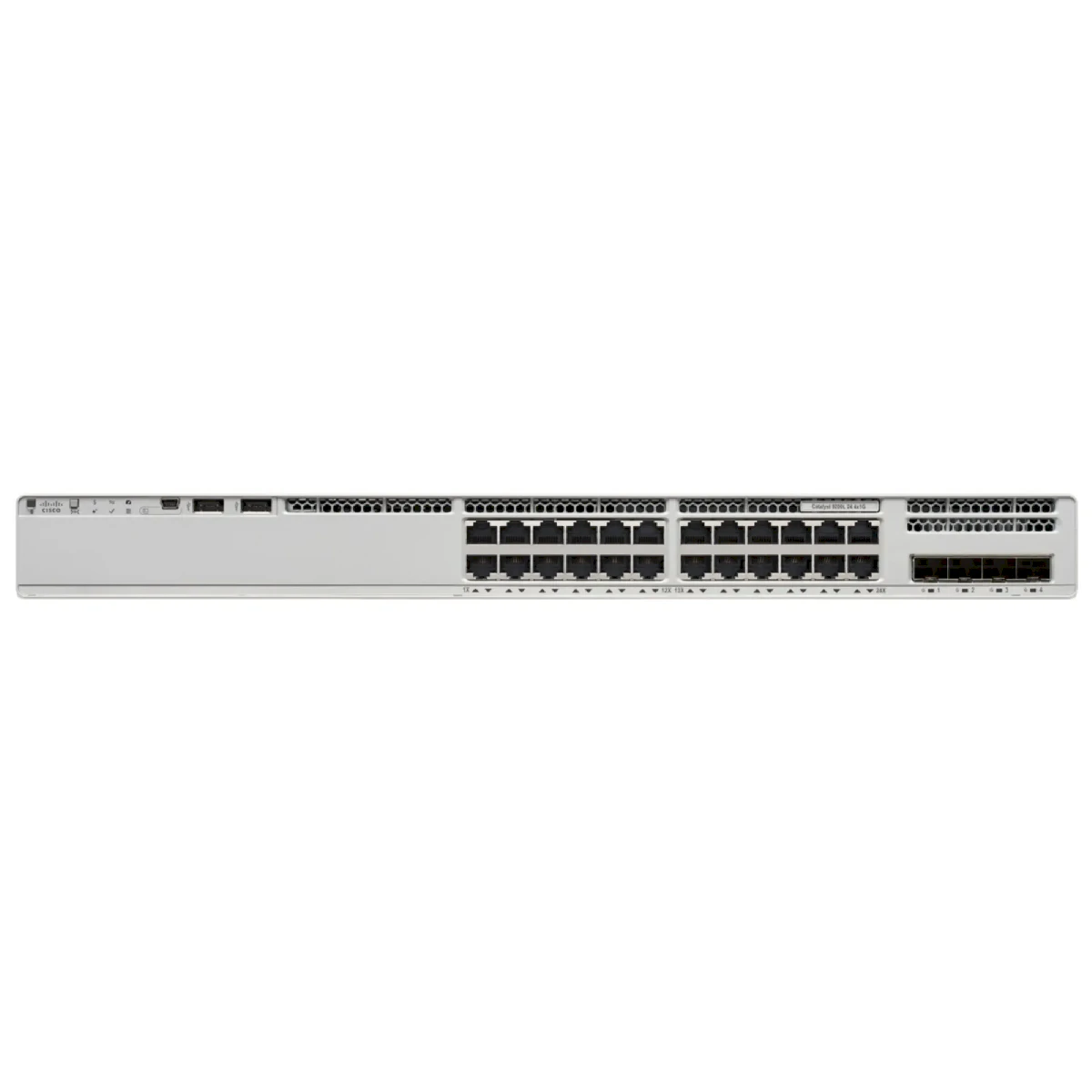 El Cisco Catalyst 9200L C9200L-24P-4G-E cuenta con 24 puertos 10/100/1000 Base-T con capacidad PoE+ (IEEE 802.3at), más 4 puertos SFP de 1G fijos para uplink sin PoE.