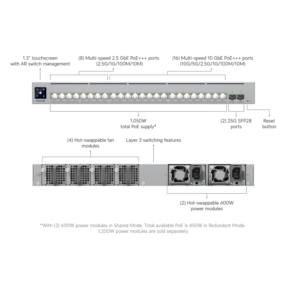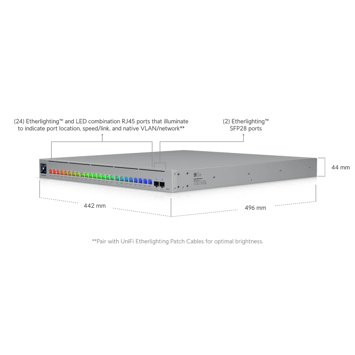 El Ubiquiti ECS-24-PoE es un switch administrable de capa 3 pensado para redes empresariales de alta demanda. Integra 24 puertos PoE+++ capaces de alimentar equipos exigentes, junto con puertos SFP28 de alta velocidad para troncales. Su arquitectura ofrece alta capacidad de conmutación y opciones avanzadas de redundancia eléctrica para asegurar continuidad operativa.