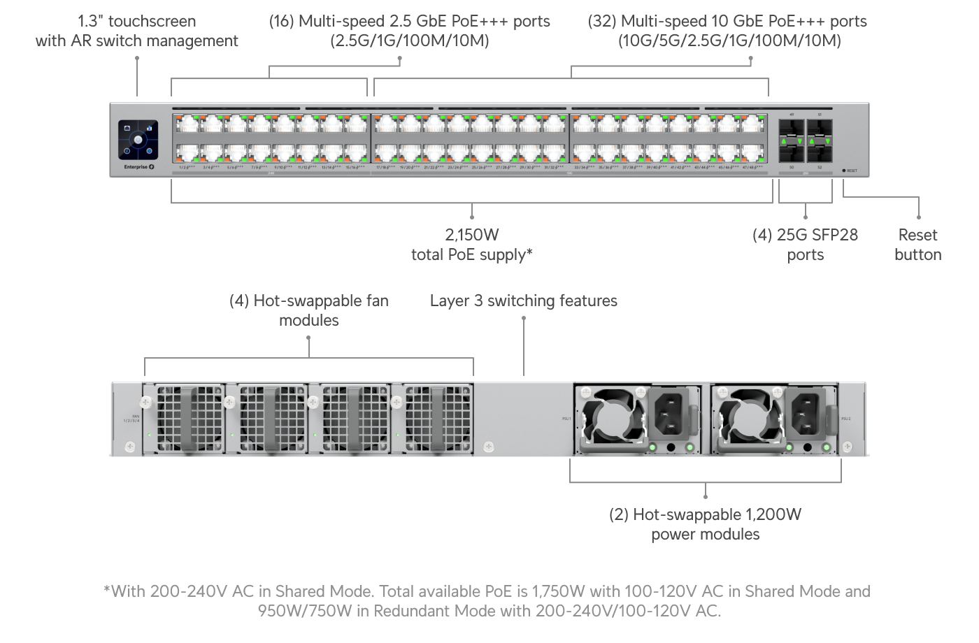 Además de los 48 puertos PoE+++ y los 4 SFP28, el switch está preparado para montaje en rack 1U de profundidad completa, compatible con racks de cuatro postes con profundidades entre 650 y 1.000 mm. El equipo usa dos módulos de energía AC/DC hot-swappable de 1.200W cada uno y cuatro módulos de ventilador intercambiables, permitiendo configuraciones de modo compartido o redundante.