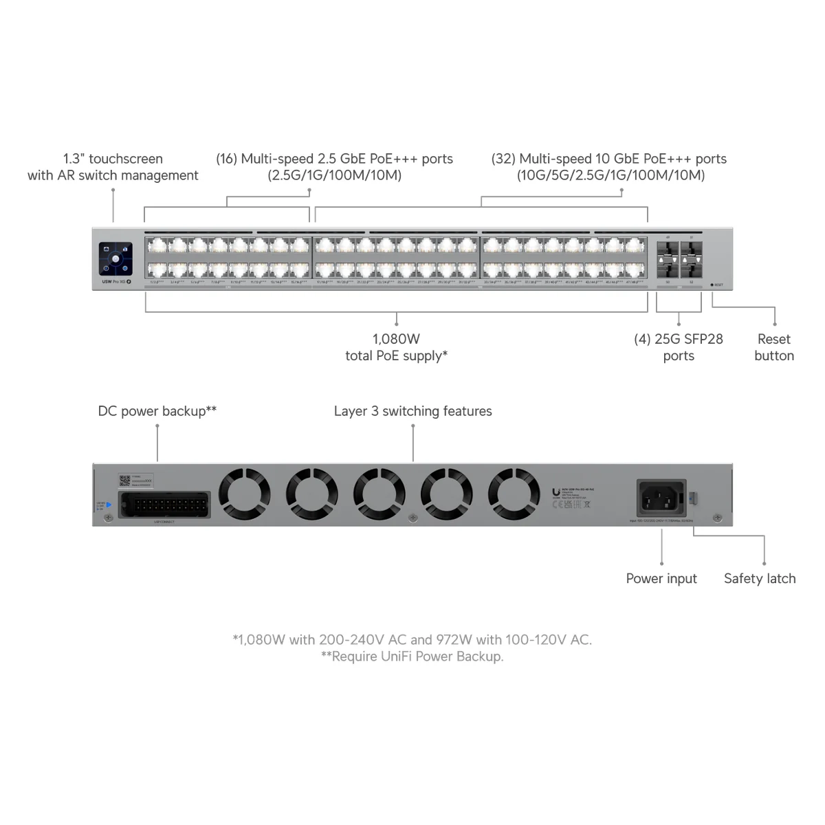 La potencia PoE total disponible es de hasta 1080W cuando se alimenta entre 200 y 240V AC, y de hasta 972W cuando opera con 100 a 120V AC.