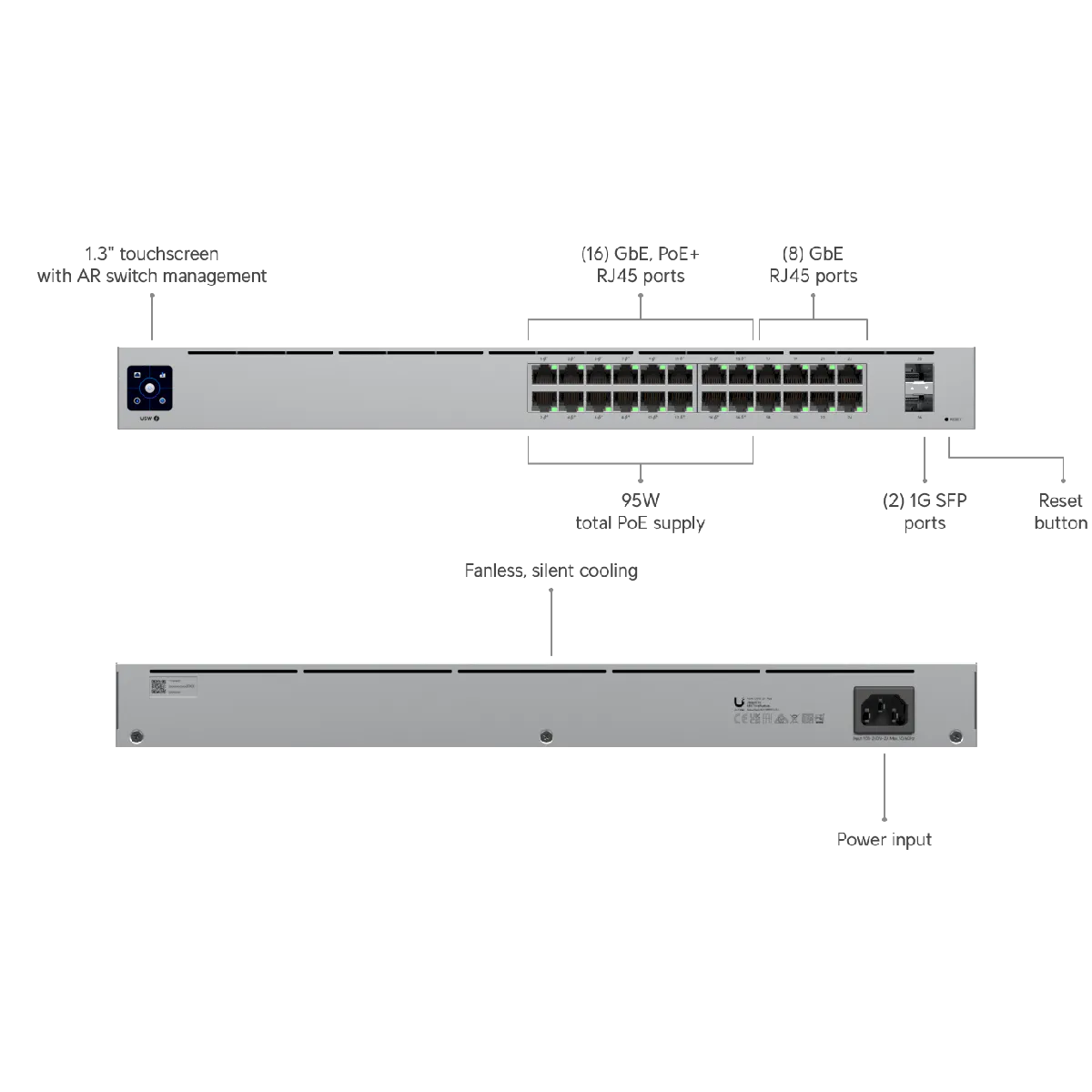Incluye 16 puertos PoE+ con hasta 32W por puerto y un total de 95W disponibles.