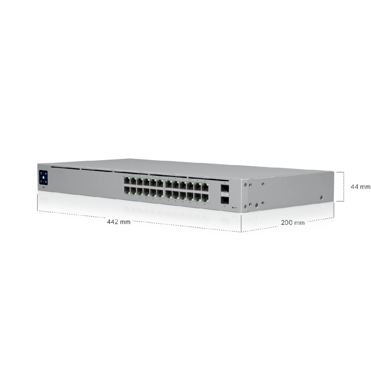 El switch mide 442 x 200 x 44 mm y pesa 3 kg sin brackets, 3,1 kg con brackets.